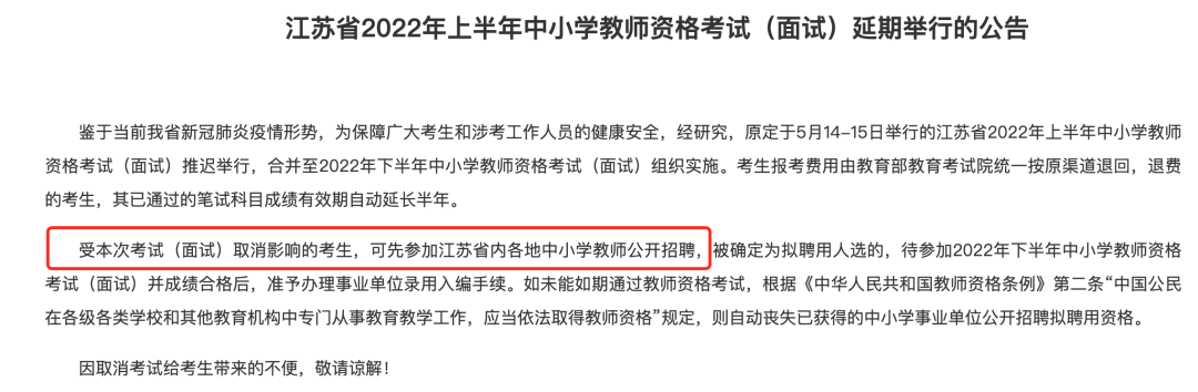 受本次考试(面试)取消影响的考生,可先参加江苏省内各地中小学教师公开招聘,被确定为拟聘用人选的,待参加2022年下半年中小学教师资格考试(面试)并成绩合格后,准予办理事业单位录用入编手续。