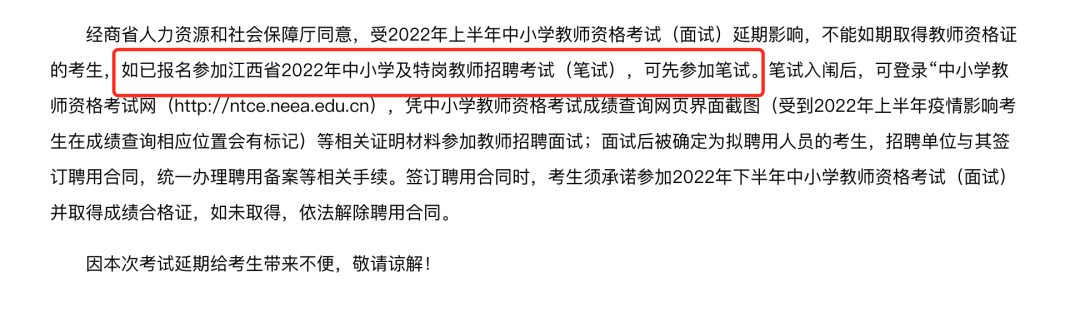 受2022年上半年中小学教师资格考试(面试)延期影响,不能如期取得教师资格证的考生,如已报名参加江西省2022年中小学及特岗教师招聘考试(笔试),可先参加笔试。笔试入序后,可登录“中小学教师资格考试网,凭中小学教师资格考试成绩查询网页界面截图(受到2022年上半年疫情影响考生在成绩查询相应位置会有标记)等相关证明材料参加教师招聘面试。